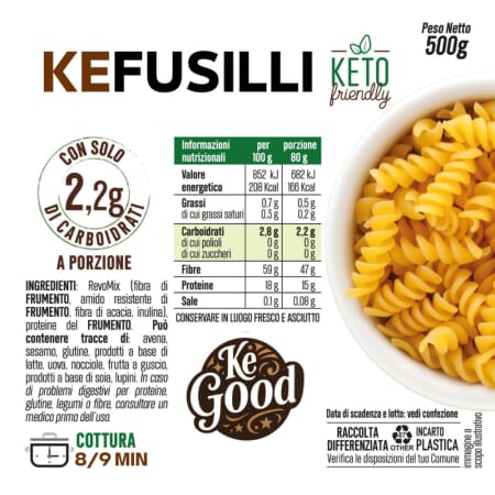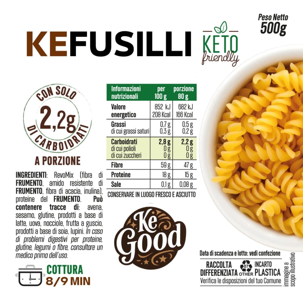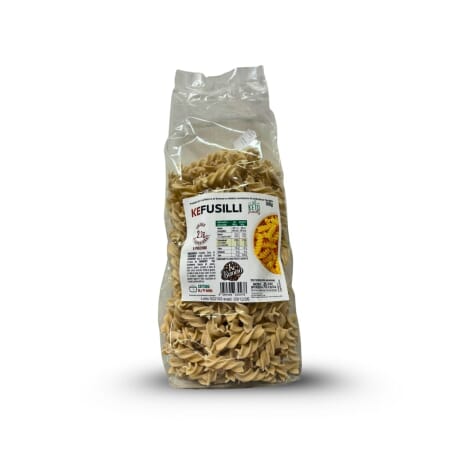 I fusilli della KEBUONO sono trafilati al bronzo e realizzati in Italia con un mix esclusivo di fibre di frumento, amido resistente e proteine del frumento, senza zuccheri aggiunti né ingredienti inutili.