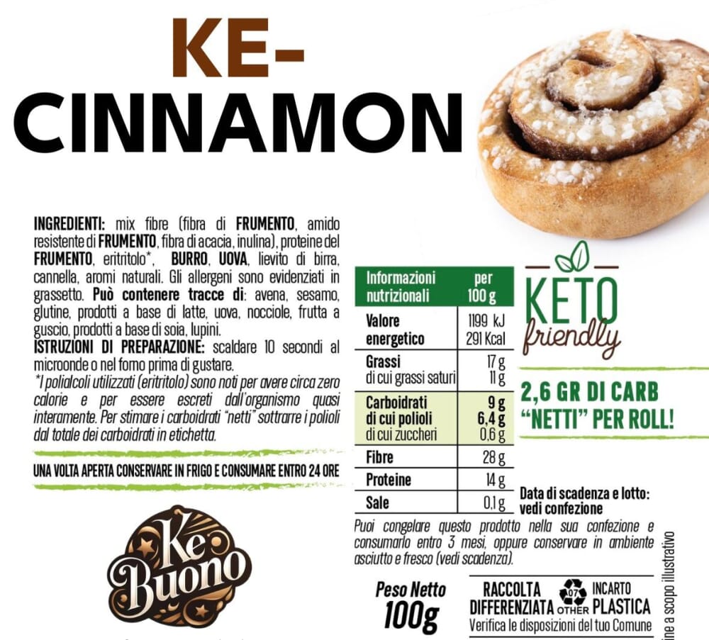 ke cinnamon roll artigianale: morbido, profumato alla cannella, solo 2,6g di carboidrati netti. Perfetto per dieta chetogenica, low carb, diabetici e controllo peso. Senza zuccheri, senza conservanti.